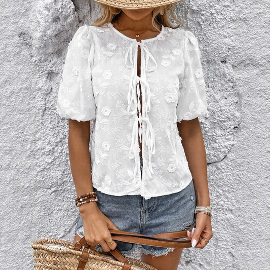 "Douceur Estivale - Chemisier Brodé Blanc Manches Bouffantes"