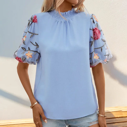 "Élégance Florale Urbaine - Chemisier Brodé Col Haut"